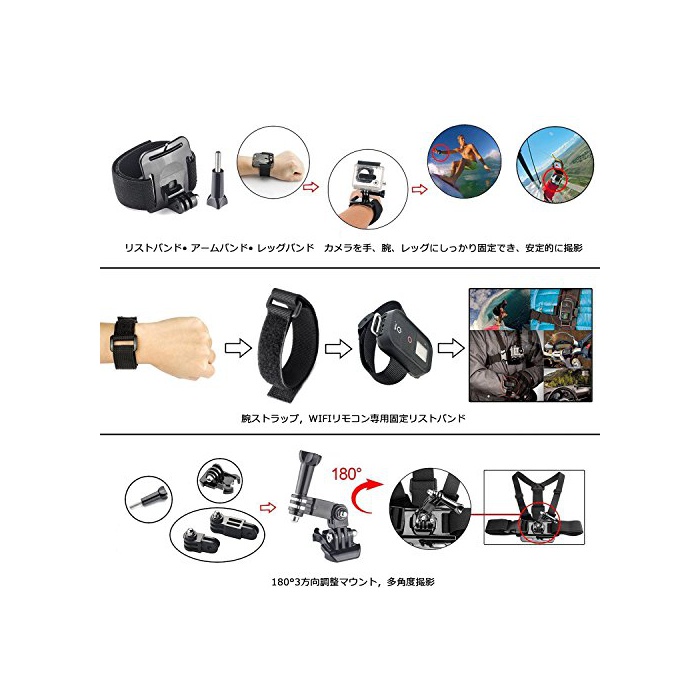 2,【악세사리 세트로 가능한 촬영 방법】:가슴의 위치에서 촬영 하는 것으로,보다 현장감이 있는 촬영 이 생긴다.악기나 보트 등에 직접Go Pro를 고정해 촬영 할 수 있다.여러가지 각도로 고 프로를 회전하게 한 다음,고정해 촬영 할 수 있다.자전거나 오토바이의 핸들등으로 장치해 촬영 할 수 있는.헤드 스트랩 마운트,팔 스트랩,흡반 홀더 마운트에 핸드프리에 자신 시선의 영상을 촬영 가능.