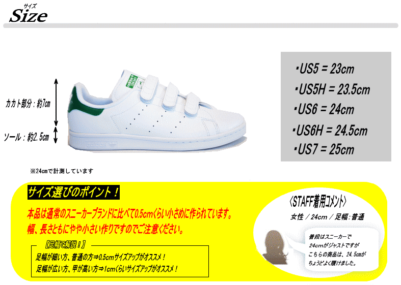 | サイズ | 作り⇒やや小さめ(横幅細め) 【サイズ選びのポイント!】 足幅が細い方、普通の方⇒0.5cmくらいサイズアップがオススメ! 足幅が広い方、甲が高い方⇒1.0cmくらいサイズアップがオススメ! |