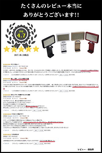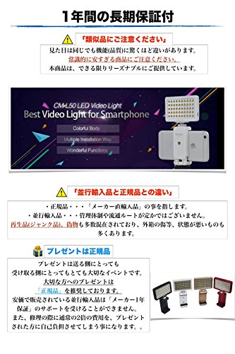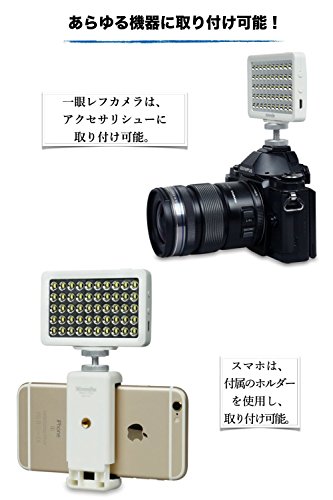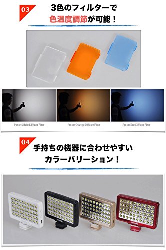 高輝度LED電球50個と12個のパターンを採用、そして業界で利用する最高のCRI>95 LEDランプで、あなたが目にする様なリアルなクオリティが実現します。 +,-の2種類のボタンを長押しするだけで、簡単に8段階の光量調整が可能です。 ホワイト/オレンジ/ブルーの3色のフィルターが付属されているので、お好みの場面で自由に取り換えることが可能です。 明るさは、旅行や夜の撮影時に使用する為に十分である6880ルクス(約10cm)の距離まで照らします。 作業時間は、フル充電した後、ローライトモードで長時間(約18時間)の作業が可能です。 品質は、80度の高温電池にも耐えられる、複数の放熱穴のデザインが採用され、耐熱に十分な安全性を可能にしました。 サイズは、「キャッシュカード」と同じで、暑さは約1cmの超スリムボディで、持ち運びに非常に重宝します。 取り外し可能なネジ穴式の為、デジタル一眼レフ,スマホ,タブレット等は勿論、お手持ちの自撮り棒やグリップハンドルにも対応します。また背面にはオリジナルのステッカーが付いており、スマホやタブレット等に直接の取り付けも可能です。
