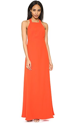 Sleeveless gown in vibrant tone featuring high neckline and T-strap back