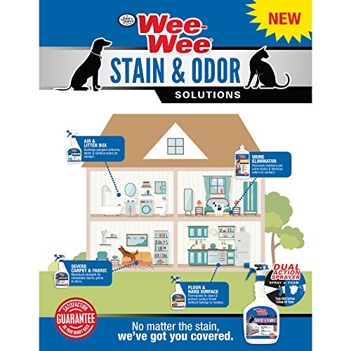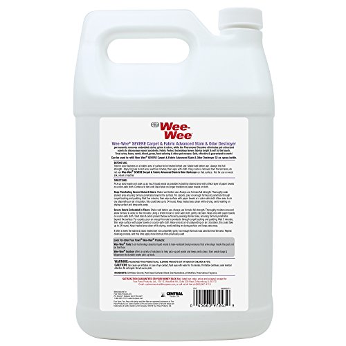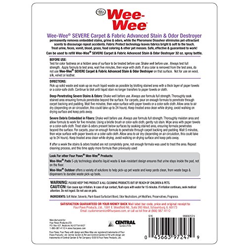 Studio : Central Pet Four Paws Publisher : Central Pet Four Paws Binding : Misc. Product Description Our Four Paws Wee-Wee SEVERE Pet Stain Odor Remover is a maximum-strength pet carpet stain cleaner that permanently removes embedded stains, grime, and odors. It's also formulated with a pheromone dissolver, which prevents your dog from soiling the same spot over and over. This severe pet stain and odor eliminator removes urine, feces, vomit, blood, grass stains, and other dog and pet messes along with their odors. Use the foaming action to clean up solid waste and the spray action to clean up liquid pet messes. Plus, it's safe to use around your pets and in your home. 0