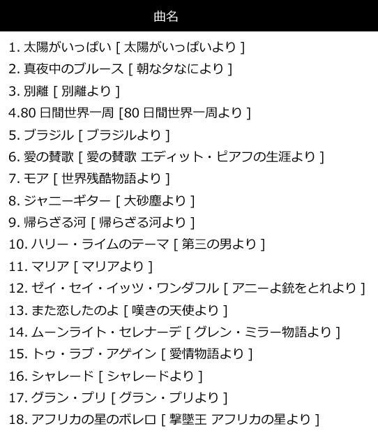 | 仕様 | 全18曲 ※全曲インストルメンタルです。オリジナル・サウンド・トラックではありません。 映画解説付き |