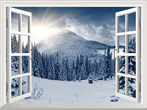 Removable Wall Sticker / Wall Mural - Beautiful Winter View of Snow Covered Mountain and Pine Trees | Creative Window View Wall Decor - 24"x32"