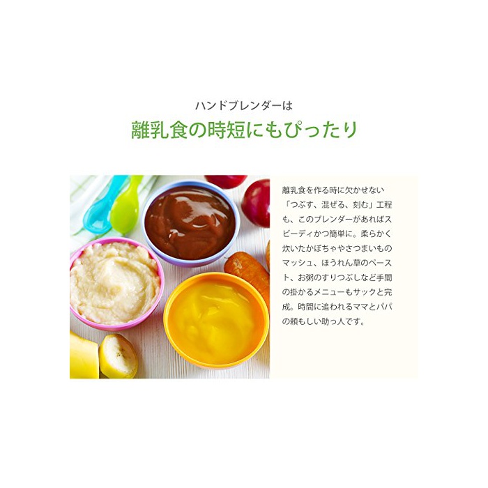 【1대 4역할】 핸드《부렌다》는「으깬다」「혼합한다」「잘게 썬다」「거품이 일 수 있다」의 4역할을 간단하게 자유자재로 쓸 수 있는 때문에,평상시의 요리가 간단 편리하게 즐길 수 있습니다.《부렌다》는 식품에 포함되는 영양을 파괴하지 않는 채로 작업합니다.가족에 영양과 건강을 줍니다.