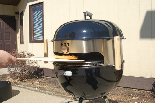 Turn your charcoal grill into a wood-fired pizza oven with a KettlePizza Pizza Oven Kit. KettlePizza works with all kettle grills including Weber and others. The basic KettlePizza kit includes a laser machined stainless steel riser sleeve, a high-temp thermometer, wood handles with stainless hardware and a 14 inch pro pizza pan. Deluxe versions include a hand-made, USA-manufactured baking stone and your choice of wood or aluminum pizza peel. Users can assemble and install the riser sleeve in minutes. The sleeve creates a cooking chamber that doesn't need to be opened to access the food. The temperature remains steady yielding superior pizza. You can use hardwood to achieve a great smokey flavor too.
