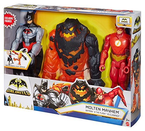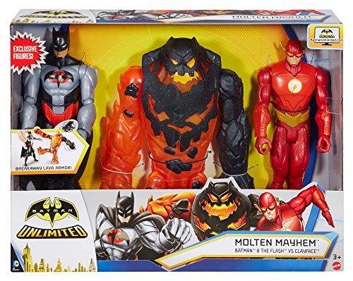-. Binding : Toy -. Brand : Mattel -. EAN : 0887961245318 -. Feature : Epic action pack with exclusive, 12" Batman, oversized Clayface figure and 12" The Flash! / Each features 9 points of articulation and authentic details as seen in DC Comics entertainment / Mutating Clayface has detachable "lava" to change his look / Recreate favorite Batman stories right out of the package with this exciting complete set / Also makes a compelling gift for collectors and fans of all ages -. IsAdultProduct : 0 -. Label : Mattel -. Manufacturer : Mattel -. Model : DKN47 -. MPN : DKN47 -. PackageQuantity : 1 -. PartNumber : DKN47 -. ProductGroup : Toy -. ProductTypeName : TOYS_AND_GAMES -. Publisher : Mattel -. Studio : Mattel -. Title : Batman Unlimited Molten Mayhem Batman & The Flash Vs. Clayface Figure 3-Pack -. UPC : 887961245318 -. Warranty : 1 year warranty against manufacturer defects