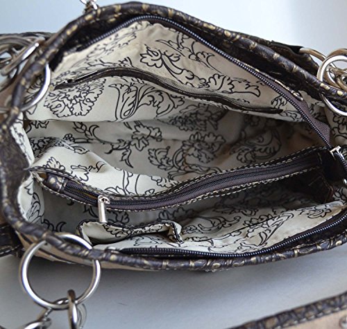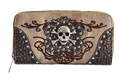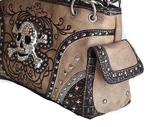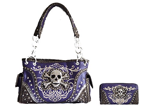 -. Feature : Silver tone rhinestone skull crossbones, studded and rhinestones accent on front / Top zippered closure, Back gun concealed carry zippered pocket, slip pocket, Interior middle zippered divider with two compartments, wall zippered pocket and two slip pockets / Exterior two magnetic flap pockets with contrsting trim and accented with studs, Dimensions: 12 1/2" x 8" x 4 1/4" / Wallet: 8 credit card slots, 3 compartments,2 slip pockets, Interior zippered coin pocket, Measurement: 7 1/2" x 4"