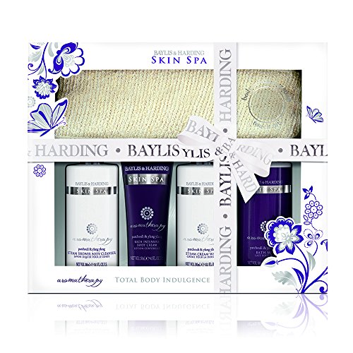 Baylis and Harding's patchouli and ylang ylang ultimate bathing set contains four bath time treats which have all been expertly developed to work in complete harmony with each other and with your skin. The aromatherapy benefits of the sensuous patchouli and calming ylang ylang create relaxing spa-like atmosphere in the comfort of your own home while the body cleanser and cream wash leave your skin feeling refreshed. The bath milk helps you to unwind and relax and the body cream locks in moisture for long-lasting softness. There is a body exfoliating strap that gives a boost to tired looking skin, unveiling a fresh, smooth look. All displayed in a stylish purple and white box with glitter embossed motif and signature Bayles and Harding ribbon, this gift set is sure to delight anyone who finds it under the tree on Christmas morning.Feature
