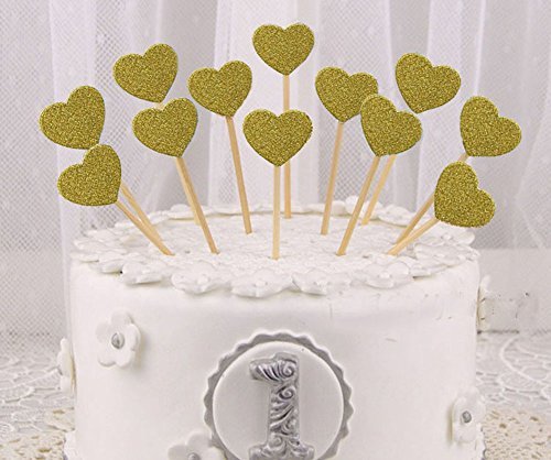 RenBa 50 Pieces Heart Cupcake Toppers Twinkle Gold Snacks Decor DIY Mini Glitter Birthday Cake Decoration Party Supllies, Gold (50 Pack)