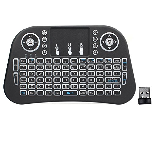 -. Feature : QQPOW Newst Mini 2.4GHz Coloful(Red,Green,Blue) Backlit Wireless Touchpad Mouse Combo Keyboard, British Layout-Pound, Smart and Portable Size, Elegant. ADDED LEFT MOUSE AND RIGHT MOUSE BUTOON DESIGN / Multimedia Remote Control and Touch Pad Functional Handheld with 92 Keys Keyboard, Comparable to the Real Notebook Touch Pad, Perfect for PC, Pad, Andriod TV Box, Google TV Box, Raspberry PI, XBMC TV Box, PS3, HTPC/IPTV, etc / Build-in Removable Rechargeable Li-ion Battery that Has Longer Standby Time and Built-in Intelligent Power Management Software for Power Conservation,Come with the USB EXTENDER CABLE, Extend for USB Receiver. / Innovative shape, portable, elegant, perfect for PC, pad, Android TV box, Google TV box, Xbox 360. This device includes built in lithium ion battery. Please use only approved data cables and chargers. Note: Fully charge the unit before initial operation. This device can be used when charging, but charging time will be extended. When the battery is low, the low-voltage light will blink to warn the user. The unit will be automatically turned off if the battery has been depleted. / Package Includes: 1x wireless keyboard, 1x wireless receiver, 1x charging data cable, 1x user manual.