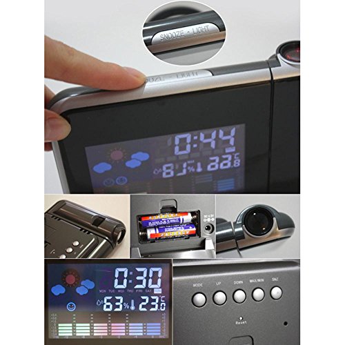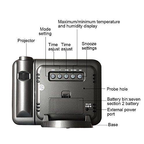 Studio : niceeshop Publisher : niceeshop Binding : Kitchen Product Description Attention: 1. Please use carbon-zinc battery, do NOT use alkaline battery, or it might damage the clock. 2. When using carbon-zinc battery as power supply, the backlight and projection will turn off automatically after a few seconds and turn on again when press the button. 3. When using plug cable as power supply, the backlight and projection will keep turning on and cannot turn off. 4. Do NOT use the battery and power at the same time, or it might damage the clock. 5. This clock does not have power off memory function. 6. The first to press the 'MODE' button can show the calendar.