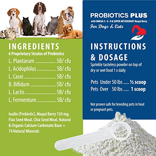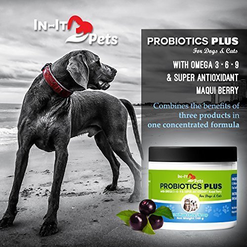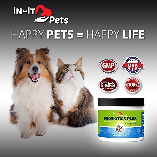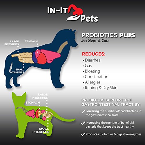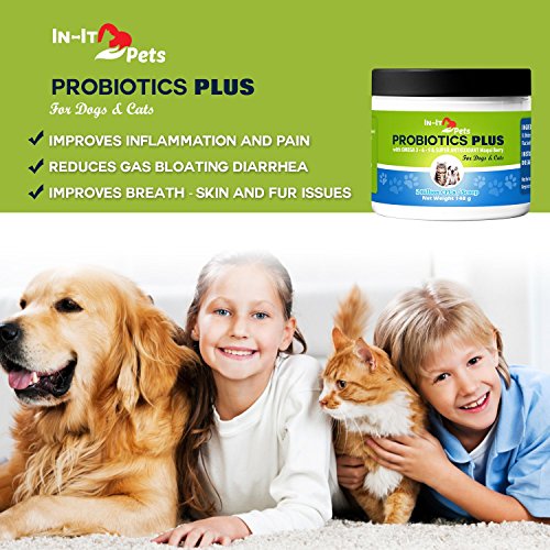 -. Feature : RELIEVES A RUMBLY BELLY: In- It Pets Probiotic for dogs and cats works fast to help gas, bloating, diarrhea, bad breath, allergies, vomiting, hairballs, and skin and fur issues. Probiotics Plus includes 6 strains of the best probiotics for dogs and cats in high concentrations to restore your pet's digestive health / 3 IN 1 COMBINATION FORMULA ELIMINATES PAIN AND INFLAMMATION FOR HAPPY PETS: Our pet probiotics contains a super antioxidant, Maqui Berry- along with Flax seed and Chia seed Omega 3, 6, 9's to relieve inflammation and pain. We are the only product that offers this unique combination- why pay more for separate supplements? / BOOSTS IMMUNE SYSTEM FOR A HEALTHIER, LONGER LIFE: Our formula includes pure inulin (prebiotic) and a base of organic calcium carbonate. Prebiotics nourish the "good guy" bacteria to improve immune function and support calcium and magnesium absorption for stronger bones. / SAFE, TASTELESS, ALL NATURAL, GLUTEN FREE, NON-GMO, NO SOY, NO FILLERS, NO CORN, NO WHEAT, NO SUGAR OR SALT: Powder is easy to dispense. No more shoving pills down your pet's throat or finding chews that haven't been eaten. There are no ingredients from China and no maltodextrin. / MADE IN THE USA AT OUR FDA INSPECTED FACILITY WITH A 100% MONEY BACK GUARANTEE: We are proud to manufacture our probiotics for cats and dogs using GMP certified practices. We want only the best for your beloved pets. At In-It Pets we stand by our product with a NO QUESTIONS ASKED MONEY BACK GUARANTEE!