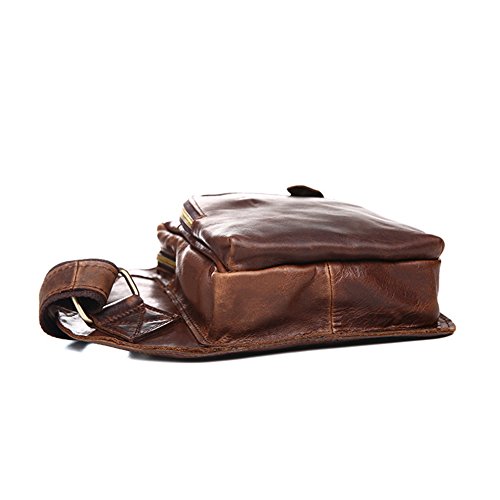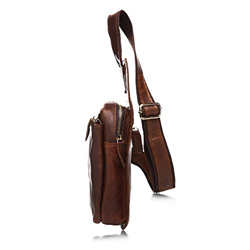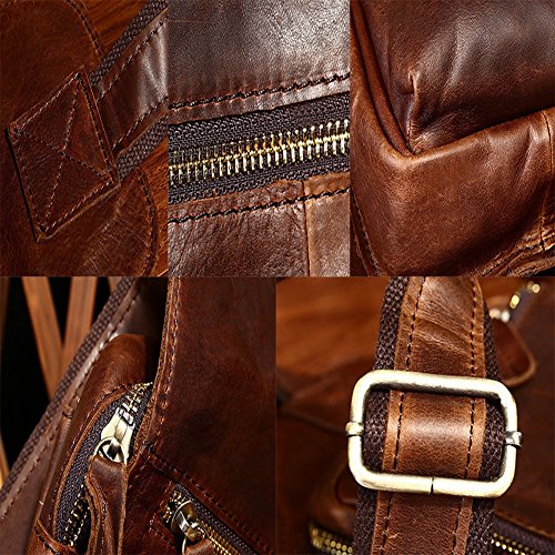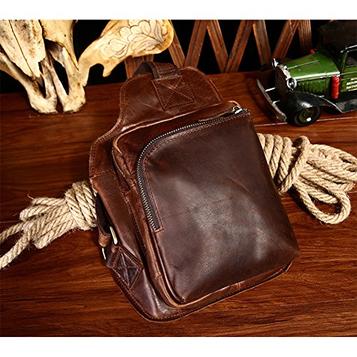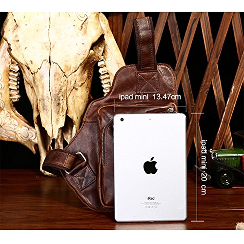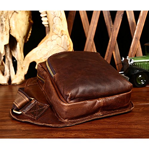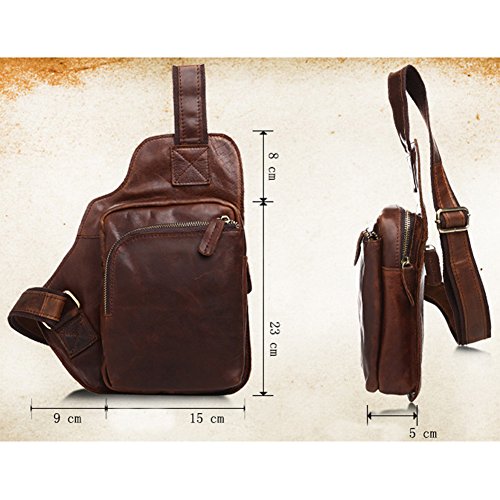 -. Feature : Mateails: 100% Genuine?Leather.The messenger sling bag is made of high quality full-grain leather,the best leather soft and durable.Sleek and elegant mercerized fabric lining protect the stuffs well. The adjustable shoulder strap is also made of genuine leather and soft canvas to eliminate shoulder fatigue, when you wear it you will feel very comfortable. / Dimension: 23*15*5 CM (L*H*W).This chest bag is a mini backpack, but it is a great size to take to a day trip or shopping. The bag can be either carried with the D ring or adjustable shoulder strap. Weight: approx. 400g. The full length of the strap: approx. 51in. / Mutifunctional Pockets: The cross body bag is practical and multifunctional. 1*zippered pocket is in the front flap for tickets, passports or 3.5" wallets&card holder.Magnet buckle about 8" deep for sunglasses in case, bottles and umbrellas. 1* main zippered roomy compartment with 1 inner zipper pocket and 1 inner slide-in pocket for phones, wallets ,books, Kindle, iPad(Up to 9.7").1*zippered pocket on the back for money, wallets, keys, ID cards. / Multifunctional Usage: 3 in 1, Transform your multipurpose bag from chest bag/ shoulder bag / crossbody bag to a backpack. It`s a 3 way bag, you could wear it in anyway you like.It`s safe , stylish, handy, lightweight and comfortable. / Protect your valuables when you're on the go with this sling bag This sling bag is made from top-grain leather and features slash-proof construction with an adjustable strap that can be slung across the body or attached to a post or a chair.