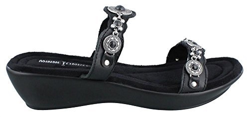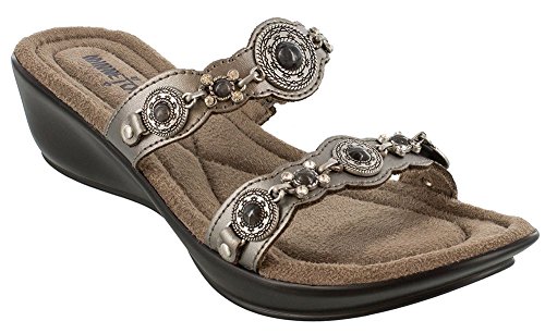 Women's Minnetonka, Boca Slide II Sandal A pretty slide with lots of fashion! Leather upper Rhinestone and metal ornament detailing for added appeal Slide style sandal for an easy on and off Suede-covered cushioned footbed for added comfort 2 inch wedge heel with a 1 inch platform Manmade outsole. Heel Height of 2.00 inches. Platform Height of 1.00 inches.Feature