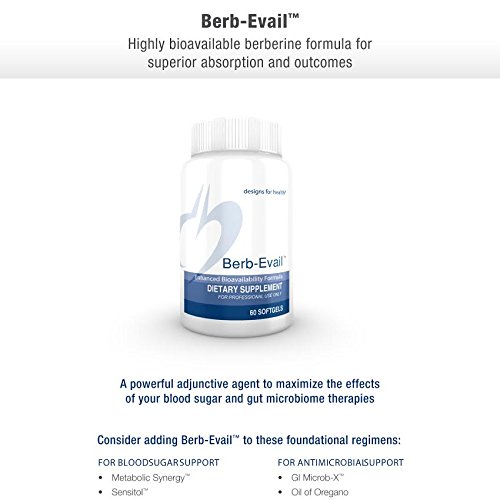 -. Feature : SUPERIOR ABSORPTION: Berberineâ€TMs effectiveness is often limited due to the bodyâ€TMs inability to completely metabolize it. Berb-Evail is manufactured using our Evail technology, which is an all-natural formulation that improves the absorption and delivery of berberine.* / PROMOTE GASTROINTESTINAL HEALTH: Berberine has been shown to exhibit antimicrobial properties, which may offer support for the gastrointestinal tract.* / SUPPORT BLOOD SUGAR METABOLISM: Berberine may offer support in maintaining blood sugar levels and promoting insulin sensitivity in individuals with already healthy levels. / SCIENCE FIRST: Designs for Health is the physician's choice for effective supplements since 1989. Our customers can rest assured that when they order from us, they are receiving top quality, professional-grade nutritional supplements formulated and manufactured in a GMP certified facility in the USA according to our "Science First" approach.
