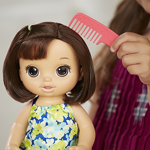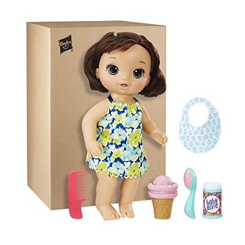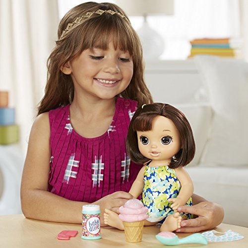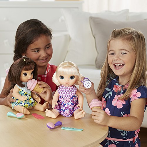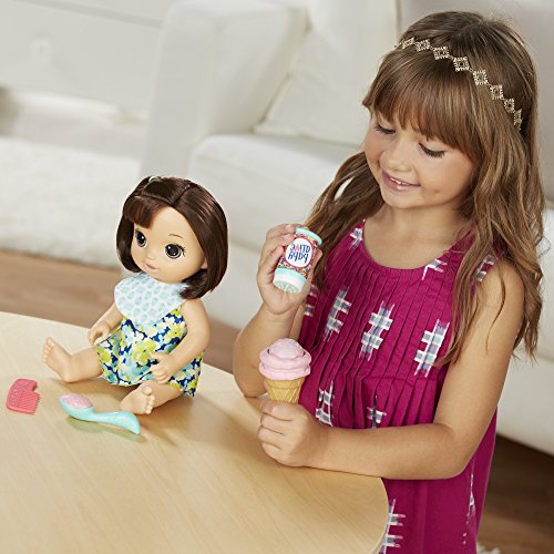 Share a sweet experience with the Baby Alive Magical Scoops Baby doll! Girls and boys can have fun preparing the pretend ice cream cone for their baby to eat. Press the scooper against the cone to begin making her snack. Pretend to add toppings, too -- shake the sprinkles shaker to hear a fun noise. Press the ice cream cone against the doll's mouth. . .all gone! The scoop retracts into the cone so kids can pretend she's eaten all of her yummy dessert. Press the cone again and again to play out lots of sweet times together. Pretend to wipe her face after her tasty treat using the included bib. The Magical Scoops Baby doll also comes with a comb for brushing her rooted hair before or after enjoying her cone. Baby Alive and all related properties are trademarks of Hasbro.Feature