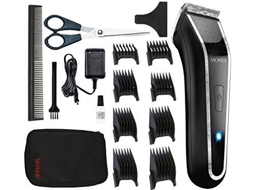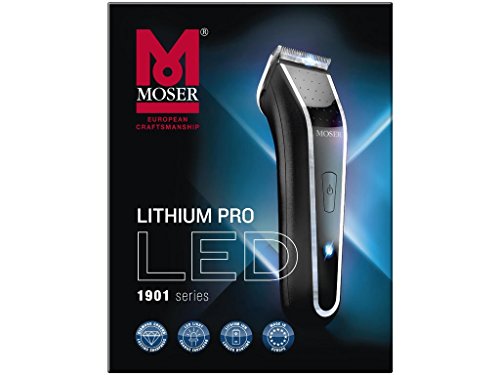 - PACKAGE INCLUDING: Moser 1901 Lithium Professional Hair Clipper, 8 slide-on attachment combs 3, 6, 9, 12, 16, 18, 22, 25 mm, Energy-efficient plug-in transformer, Cleaning brush, Oil, Scissors, Pouch.