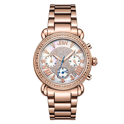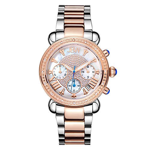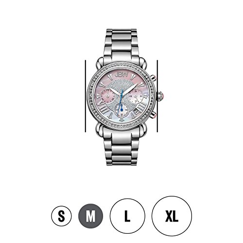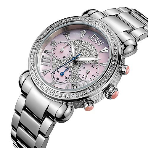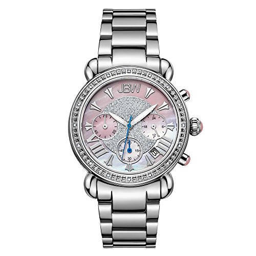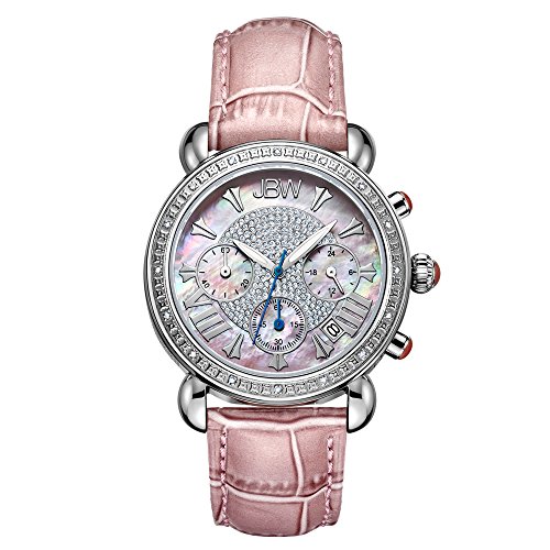 Crystal accented center with 3 sub dials, stylish design and roman numeral hour indicators on a pink mother-of-pearl dial