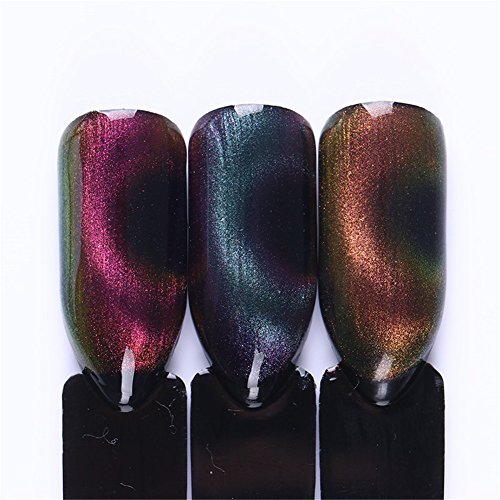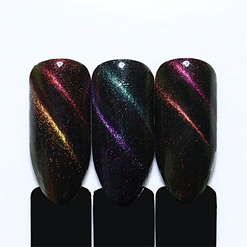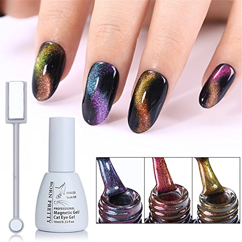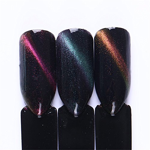Instructions: 1.Prepare your nails with UV BASE COAT, and cure it under UV / LED lamp. 2.Apply the black color coat, cure dry, then 2nd coat,cure dry.(Darker base can help to get better chameleon effect) 2.Apply cat eye gel(DO NOT Cure!) 3.Use the magnet stick ( not included in the package)close to nail. The closer distance, the more obvious effect. But keep away from the gel. The effect is according to the line of the magnet stick and the dirction you put it. 4.Cure it under UV lamp or LED lamp. 5.Apply BORN PRETTY no wipe top coat, and cure it under UV / LED lamp.
