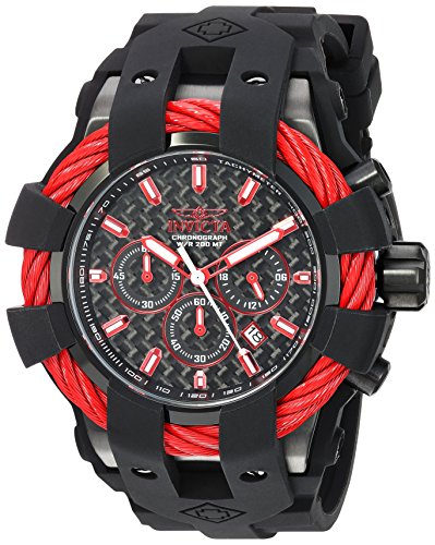Invicta 23869 Bolt Sport chronograph men's dive watch features a 48mm wide and 19mm thick black ion plated solid stainless steel case with a fixed red cable wire accented bezel and textured screw down crown with function pushers. Invicta 23869 is powered by Japanese SII VD53 quartz chronograph movement. This stylish watch also features a textured black carbon fiber dial with white accents red luminous skeleton hands and index hour markers along with the chronograph, 12/24-hour time and date display functions, scratch resistant mineral crystal and water resistant to 200 meters. Invicta 23869 is equipped with a 32mm wide black silicone rubber strap with a buckle clasp. Invicta 23869 men's Bolt Sport red bezel black silicone strap chronograph dive watch is brand new and comes in an original Invicta gift box and is backed by a 5 year limited warranty.Feature