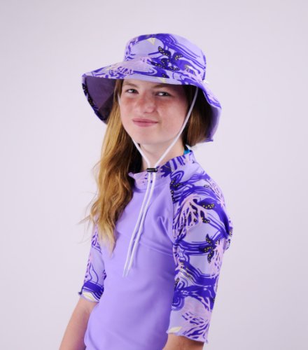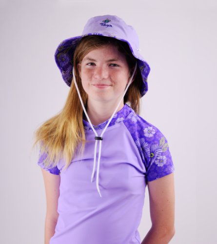Ein schicker Sonnenhut mit UPF50+ von TUGA Sunwear. Der Hut kann zur TUGA Sonnenschutzkleidung assortiert werden. Bestickter TUGA-Logo auf der Uni Seite. Die Kinnschnur kann an windige Tage für festen Halt benützt werden, kann aber auch entfernt werden. Ihre Tochter wird diesen Hut lieben! Der Hut kann auch im Wasser benützt werden, trocknet schnell. Der Stoff sichert den UPF-Schutz durch die Webedichte, es werden keine chemischen Stoffe benützt.Feature