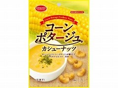 原材料:カシューナッツ(インド)、小麦粉、砂糖、コーンポタージュシーズニング(砂糖、食塩、スイートコーンパウダー、コーンスターチ、酵母エキス、乾燥パセリ)、寒梅粉、粉末水飴、デキストリン、マルチトール、加工でん粉、調味料(アミノ酸等)、香料、膨張剤、微粒二酸化ケイ素、カロチン色素、甘味料(スクラロース)、(原材料の一部に乳、大豆を含む)