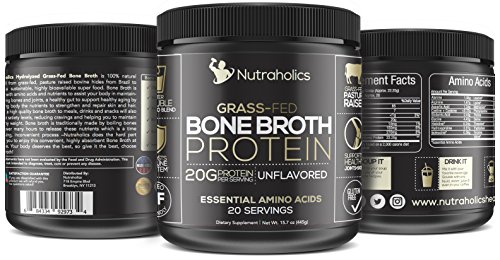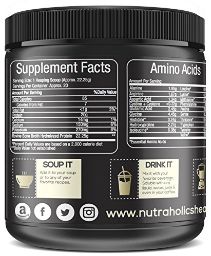 Enjoy The Health Age-Reversing Benefits of Bone Broth Our ancestors enjoyed younger-looking skin and better digestive health because they consumed bone broth. Perhaps you've heard of bone broth's abilities to reduce inflammation, swelling and joint pain, but you don't have time to boil bones. Or you're not sure you're getting pasture-raised protein from supplemental bone broth. What if you could drink bone broth anywhere and at your own convenience? And what if you could be sure you're getting your beef protein from grass-fed cows? What You Get Each 15.07 oz container provides 20 servings of organic pasture-raised bone broth protein powder. With 20 grams of protein in each scoop you feel secure knowing you're hitting your daily recommended protein intake. Premium Hydrolyzed Bone Broth Many companies cut costs by including filler ingredients in their supplements. These ingredients won't help you achieve your health goals. In all Nutraholics products, you can enjoy peace of mind, knowing that you're getting only keto-friendly and paleo-friendly compounds, and no artificial chemicals. Made In America Rather than outsource operations to China, we kept our manufacturing right here in New York. This means you're getting all the right ingredients and we support the local economy. Test-Drive Nutraholics High Protein Bone Broth Every one of our products comes with a 90-day guarantee. If you don't love your pure bone broth powder, just let us know within 90 days to receive a full refund. Tap into the ancient healing power of collagen and give your body the tools it needs to heal itself. Click Add to Cart now and watch your health transform! 0