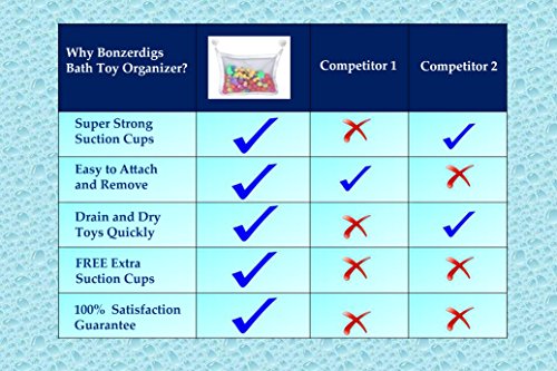 2) Bonus suction cups are perfect for glass and mirrors. The Bag - The size of the bath toy bag is optimized to hold large number of toys.
