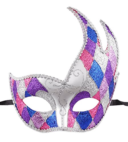 -. Feature : One Costume Mask / Adult size (One Size fits most) / Measures 7.75"H x 6.25"W; Secures with two black ribbon ties on back / Features a flare half eye mask with a glittered pink, purple, blue & silver harlequin pattern that has a laced trim / Makes a great accessory for a Mardi Gras themed party or masquerade ball!