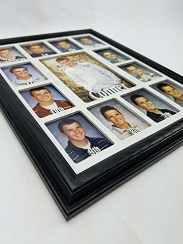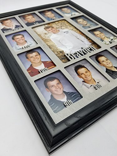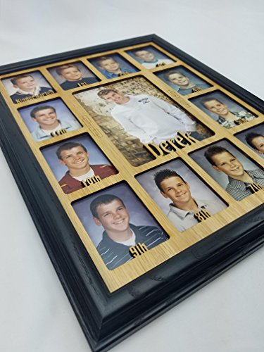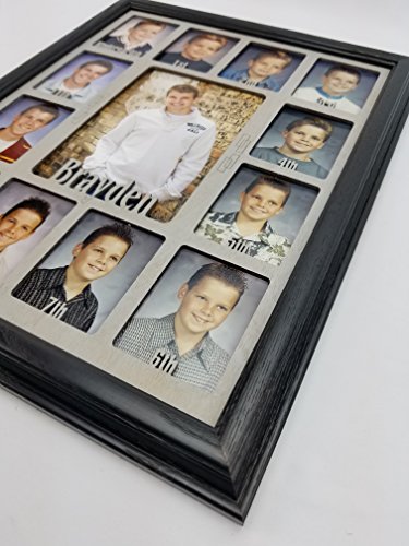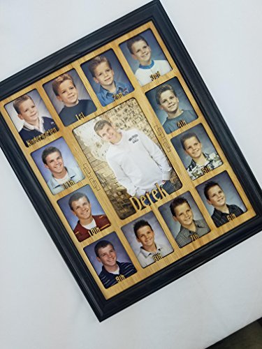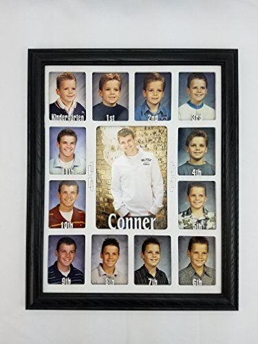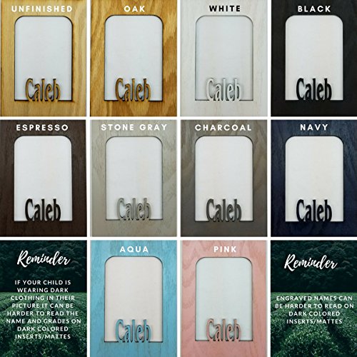 -. Feature : Include your child's first name by adding it to the "Gift Message" portion in the ordering process or sending us a message immediately after ordering. No Changes can be made 48 Hours after Ordering. / FITS STANDARD WALLET SIZE SCHOOL PHOTOS: Our School Years Picture Frame is 11 inches by 14 inches. The Personalized School Photo openings measure 2 and 1/4 inch by 3 and 1/4 inch and will fit standard wallet size School Pictures. The center School Photo opening measures 5 inches by 7 inches. / AVAILABLE IN A VARIETY OF COLOR OPTIONS AND COMBINATIONS: All School Years Photo Frames are available in the following colors: Unfinished, Oak, White, Black, Espresso, Stone Gray, Charcoal Gray, Navy, Aqua and Pink. Please let us know the color you'd like, both the Picture Frame and the School Picture Insert to be. You can do so by sending us a message or including it in the "Gift Message" portion of the ordering process. (Pictured is a Black Picture Frame and Black Matte) / HIGHEST QUALITY MATERIALS: Included in your purchase of this Custom Picture Frame is: Handmade Oak Picture Frame, Personalized K-12 School Days Insert, glass to protect all those school photos, decorative p sheet, cardboard backing with easy access tabs, and a sawtooth hanger for hanging. We recommend using scotch tape to secure all those great school pictures in place. / PERFECT GIFT: Our line of Personalized Picture Frames make the perfect gift for mom, gift for dad, or gift for yourself! They also work great as Mothers day gifts, Fathers day gifts, Christmas Gifts, or for any other holiday gifts. All of our School Year Frames are made to order and ship within 5 business days. (As long we have all the information we need from you)