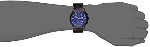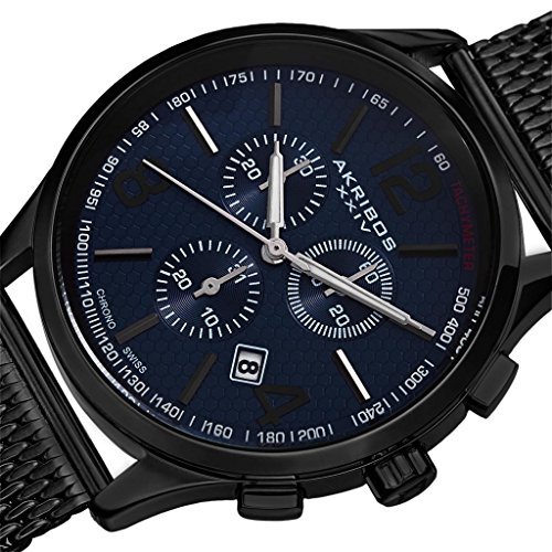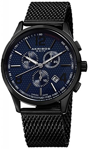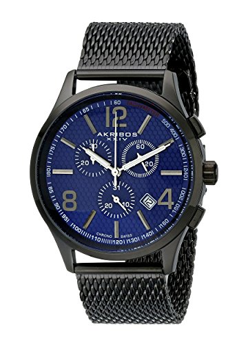 Studio : Akribos XXIV Publisher : Akribos XXIV Binding : Watch Product Description Stainless steel case with a stainless steel mesh bracelet. Blue, etched pattern dial with silver-tone, luminescent hands and Arabic numerals, batons, black hour markers. Dial Type: Analog. Luminescent hands. Date display at 4:30 position. Chronograph - sub-dials displaying: three subdials: date, 60 second and 30 minute timer. Quartz movement. Scratch resistant mineral crystal. Push/pull crown. Snap-down case back. Case diameter: 42.5 mm. Case thickness: 11 mm. Round case shape. Band width: 22 mm. Band length: 9 inches. Sliding buckle clasp. Water resistant at 30 meters / 100 feet. Functions: date, hour, minute, second. Watch label: Hong Kong. Akribos XXIV Stainless Steel Mens Watch AK719BU. 0