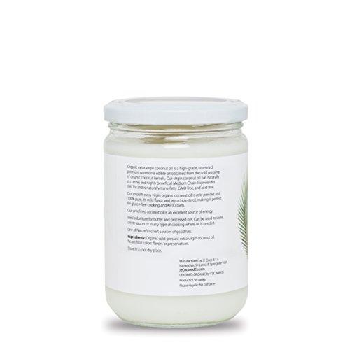 JE Coco & Co. presents the purest organic coconut oil on the market. This pure, extra virgin coconut oil is certified 100% organic by the United States Department of Agriculture (USDA) and Control Union Certifications (CUC). This product consists of pure coconut oil and nothing else. It contains no artificial colors, flavors, or preservatives. In addition, this is a certified non-GMO and gluten-free product. JE Coco & Co. takes social responsibility seriously. Not only is our coconut oil organic, our packaging is also recyclable. Whether you choose our 500 ml. option or our 1000 ml. option, your organic coconut oil will come in a recyclable glass jar. The coconuts we use are handpicked in Sri Lanka, where coconuts grow abundantly. In fact, coconuts make up for approximately 12% of all agricultural produce in Sri Lanka. JE Coco & Co.'s virgin coconut oil is cold pressed, which is a process that sets our coconut oil apart from other more refined varieties. Our high-grade coconut oil is obtained through mechanically pressing the coconut kernel at temperatures not exceeding 120 degrees Fahrenheit. This cold-pressing process ensures that the coconut oil's natural nutrients are preserved in their original state as much as possible. Our cold pressed coconut oil is not refined, processed, or deodorized, providing you with optimal nutritional effectiveness. Furthermore, our coconut oil is high in Medium Chain Triglycerides (MCT's). These naturally occurring MCT's are highly beneficial and easier to digest than long-chain triglycerides. Studies show that they may help in the process of excess calorie burning and weight loss. With its mild flavor, our cholesterol-free coconut oil is the ideal butter substitute. You can use coconut oil for cooking popcorn, for sautéing, for making sauces, or for any other type of cooking that requires oil. You can also use our coconut oil for hair and skin. It is a natural moisturizer, and can even be used to repair chapped lips.Feature