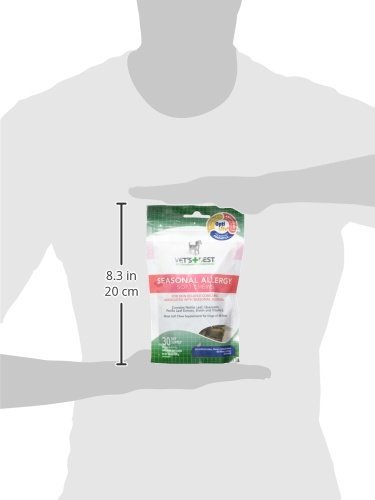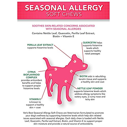 (3 Pack) Vet's Best Seasonal Allergy Soft Chews Dog Supplements,Each a 30 Day Supply. Vet's Best Seasonal Allergy Soft Chews (30ct) for dogs helps to promote your dog's wellness by soothing skin-related concerns associated with seasonal allergies in a once-a-day soft chew supplement. Seasonal Allergy soft chews support normal histamine levels, helping skin related issues associated with seasonal allergies. Each daily soft chew is loaded with Nettle Leaf, Quercetin, Perilla Leaf Extract, Biotin and Vitamin E to support histamine levels, proper skin moisture and provide a natural source of antioxidants. Made with OptiLife3* Formula that contains natural Ocean Kelp that provides antioxidants to help reduce the effects of normal environmental stress, to help support a healthy immune system and Prebiotics to help support digestion and ingredient uptake. Vet's Best Soft Chews Supplements are extra moist, made with quality, natural ingredients, great tasting and have efficacious formulations with a high level of bioavailability for optimal absorption.Feature
