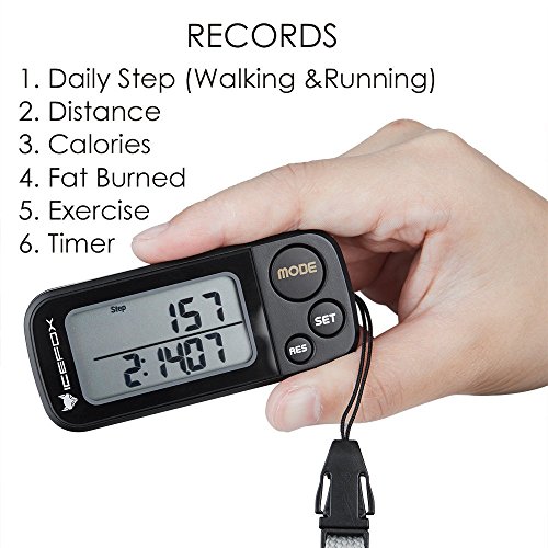 icefox Walking 3D Pedometer with Clip and Strap,Free eBook,30 Days Memory,Best Accurate Step Counter,Walking Distance Miles and Km,Calorie Counter,Daily Target Performance Monitor,Exercise Time