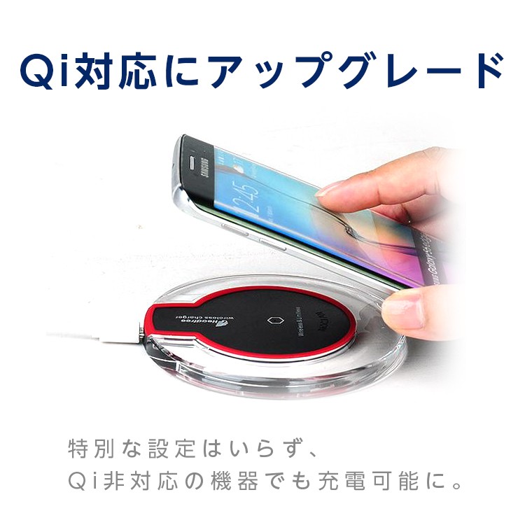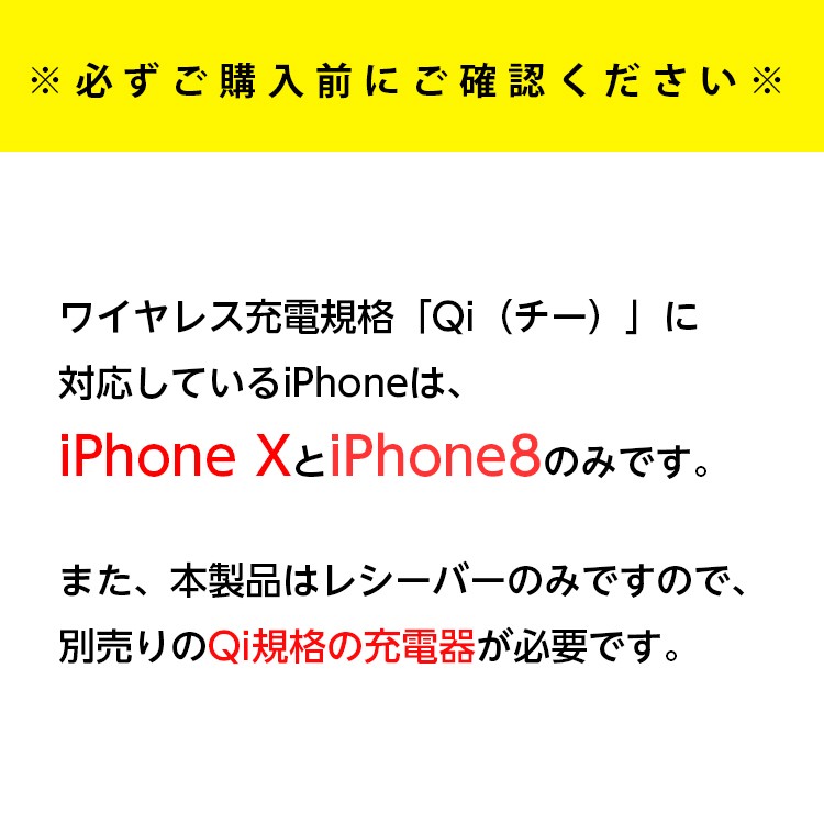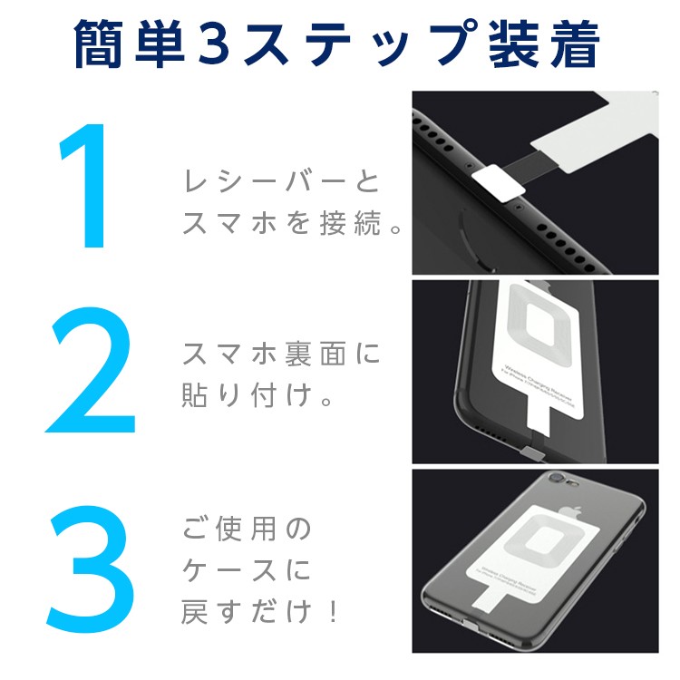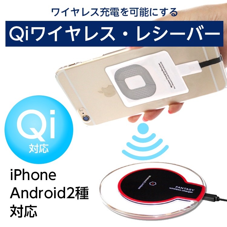 Qi(チー)ワイヤレス充電レシーバーチップQi非対応機種をQi対応にアップグレードしてワイヤレス充電が出来るアダプターシート。iPhoneでワイヤレス充電が可能。充電ドックに差し込み本体裏側に貼り付けるだけで、iPhoneでワイヤレス充電が出来るようになります。iPhoneタイプ、microUSBタイプ(上向き/下向き)※入荷時期により多少のデザインの変更がある場合がございます。※専用のワイヤレス充電器が別途必要になります。Qi対応の充電器をお持ちの方はそのままお使いいただけます。iPhoneタイプ対応機種iPhone7iPhone7PlusiPhone6/6siPhone6Plus/6sPlusiphone5/5s/SE