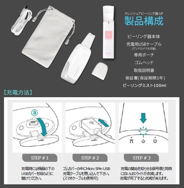 | セット内容 | ピーリング器本体(ゴムヘッド付)、Micro 5Pin USB充電ケーブル、製品保管用ポーチ、ピーリングミスト100ml、説明書、保証書(保証期間1年) |