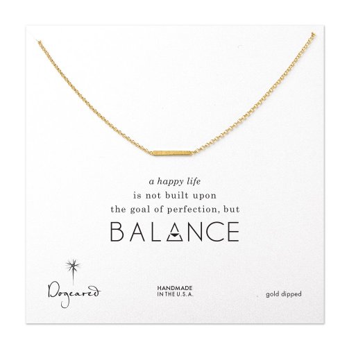 -. Feature : 18'' gold filled fine cable chain / .6" gold dipped balance bar / spring ring closure / balance bar message card reads:card message a happy life is not built upon the goal of perfection but balance. / made in the u.s.a. / packaged in a dogeared gold gift box