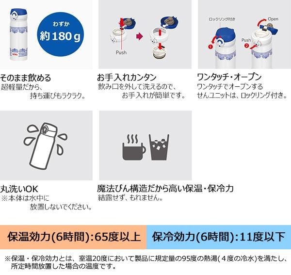 | 保温にも保冷にも対応したマグタイプの水筒です。魔法びん構造だから高い保温・保冷力。ワンタッチ・オープンですばやく水分補給ができます。重さわずか約180gの超軽量タイプなので持ち運びもラクラク。飲み口を外して洗えるので、お手入れも簡単です。 |