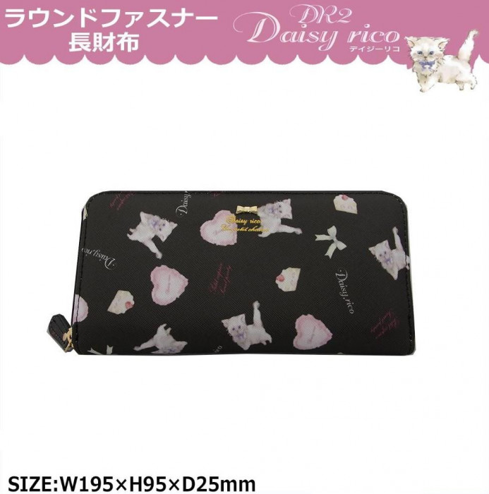ねこやハートクッションなど可愛い柄がデザインされた、ラウンドファスナー長財布です。カード収納・お札やレシート、小銭をすっきり収納できるのが魅力です。 |