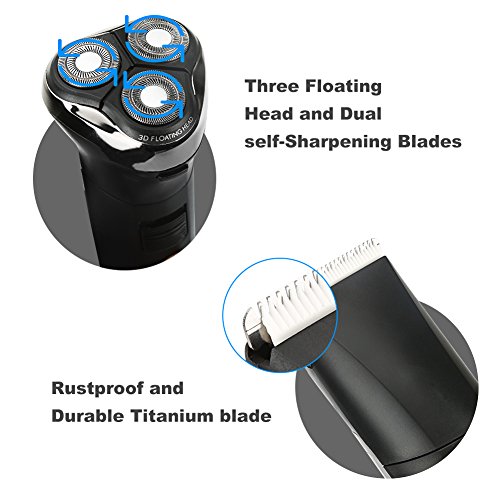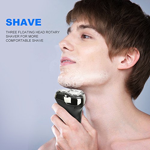 【Smooth & Close Shave】This 3D rotary shaver can adjust heads automatically according to every curve of your neck or face, minimizing pressure and irritation on your skin.The dual self-sharpening blades can shave even the shortest details hairs on the neck,sideburns and behind the ears. 4 different size guide combs make you easy to cut your favorite hair length.