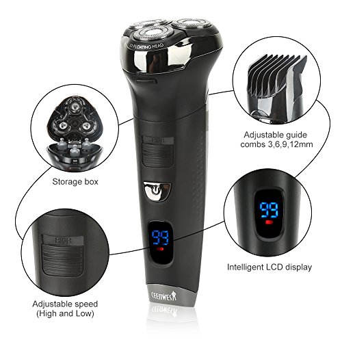 【Ergonomic Design】Ergonomic handle of electric razor for men, which is fitted to ensure a comfortable and secure grip, This hair clippers also have alternative speeds (high and low) to your need, allow you to dedicate yourselves with the utmost care to your beard ,mustache and hair. This shaver has intelligent LCD display to indicate the charge of the shaver from 1-99.