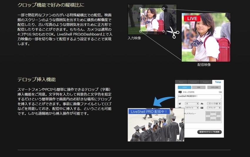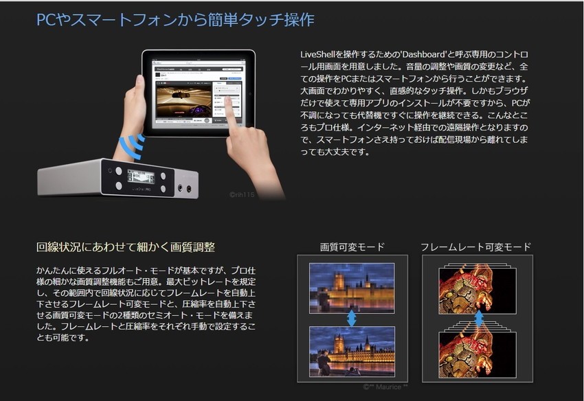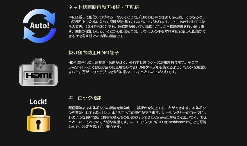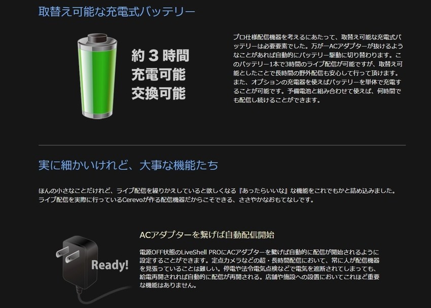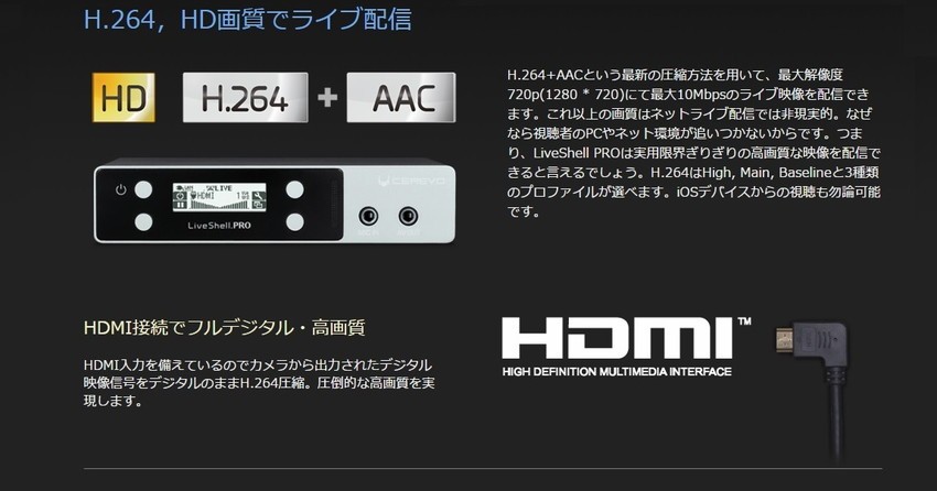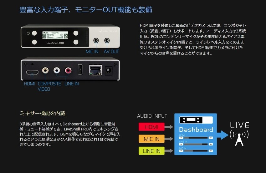 多数の配信サービスに対応し独自サーバへの配信も可能/PCやスマートフォンから簡単タッチ操作ネット接続機能:有線LAN(10BASE-T/100BASE-TX)/ 無線LAN(IEEE 802.11b/g/n)映像入力端子:HDMI(480p/720p/1080i)/ コンポジット(NTSC/PAL)音声入力端子:HDMI-IN / ステレオマイクIN / ステレオラインIN 映像・音声出力:専用端子からブレイクアウトケーブル(別売)にて対応電源 : ACアダプター(DC 5V) 消費電力 : 7.5W