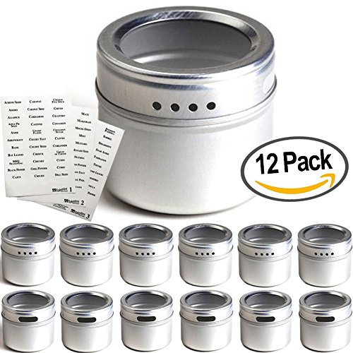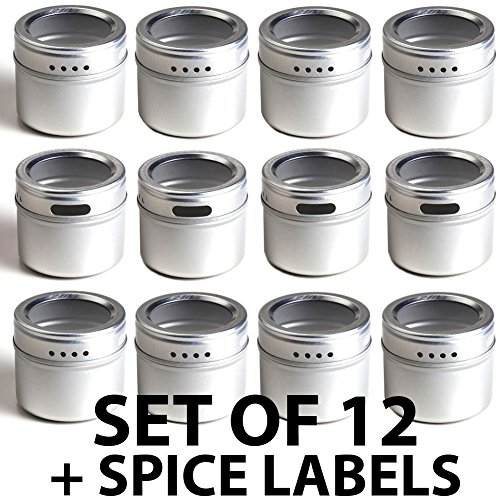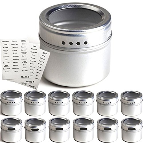 12 Magnetic Spice Tins and 113 Spice Labels by Talented Kitchen. Round Storage Spice Rack Set of 12, Clear Top Lid with Sift or Pour. Includes 113 PVC Spice Sticker Set. Magnetic On Refrigerator