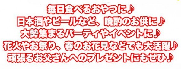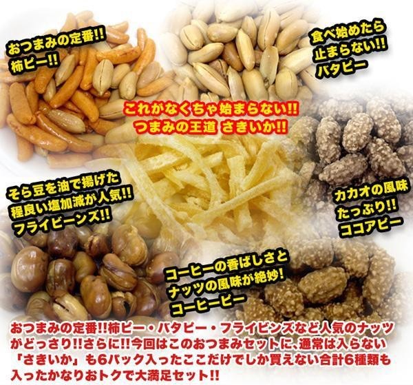 | 「ナッツ」や「さきいか」など6種のおつまみの定番がぎっしり!!うれしい個包装です。毎日食べるおやつに。大勢集まるパーティやイベントにもおすすめです♪ |