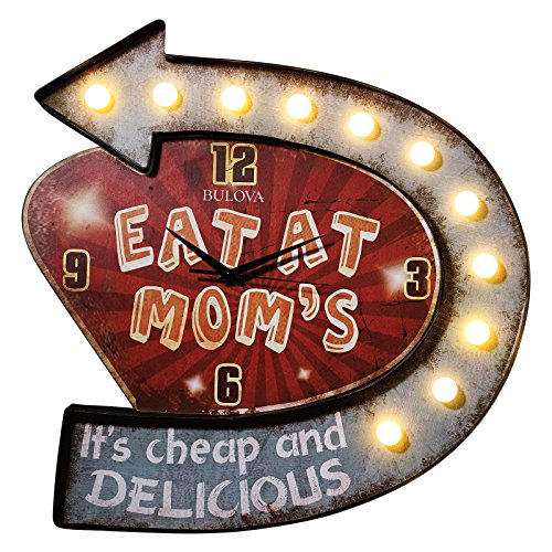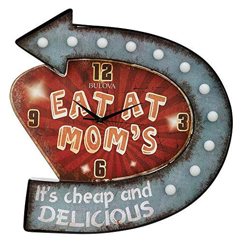 -. Feature : Dimensions: 18W x 2D x 18.5H in / Multicolor metal construction / Eat at mom's'' design / Numbers at the quarter hours / Illuminating lights on the arrow