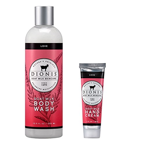 Dionis Goat Milk skincare gift set that includes one 12-ounce Body Wash and one 1-ounce Hand Cream in "Love" scent.