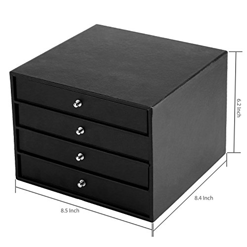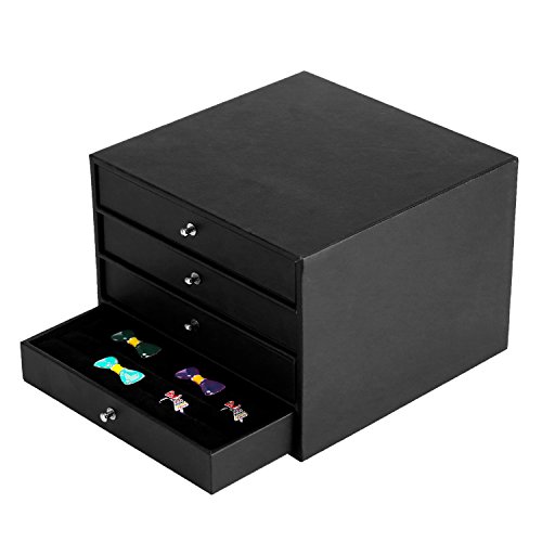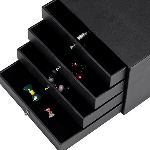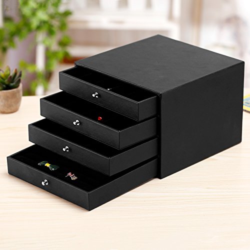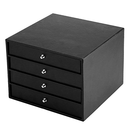 Studio : MyGift Publisher : MyGift Binding : Kitchen Product Description Organize and protect jewelry on the dresser or in the safe with this versatile jewelry case wrapped in black faux leather. Featuring four organizing drawers for rings, necklaces, earring, and various small pieces, this multipurpose jewelry box has a simple design which allows several to be stacked or placed side-by-side in a safe or closet for additional storage. Each tray is padded and lined in soft velour to help protect valuable pieces and keep them separated. The 3 × 3 and 4 × 4 grids are removable, allowing two of the trays to be used without dividers for larger items. Keep your collection safe and protected in this attractive and functional jewelry file case. Jewelry not included. Approximate Dimensions (in inches): 6.2 H × 8.5 W × 8.4 L; Necklace Tray Slots - 1.3 W × 7.5 L × 1.2 D; Small Grid Squares - 1.7 W × 1.7 L × 1.2 D; Large Grid Squares - 2.4 W × 2.4 L × 1.2 D 0 |
