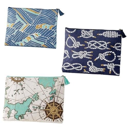 - Jute carry-all case features all-over nautical print with subtle metallic gold detail and tasseled zipper pull.