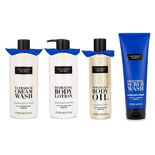 -. Title : Victoria's Secret PassionFlower 4 Piece Skin Set Including Body Lotion, Smoothing Scrub, Cream Wash, and Body Oil