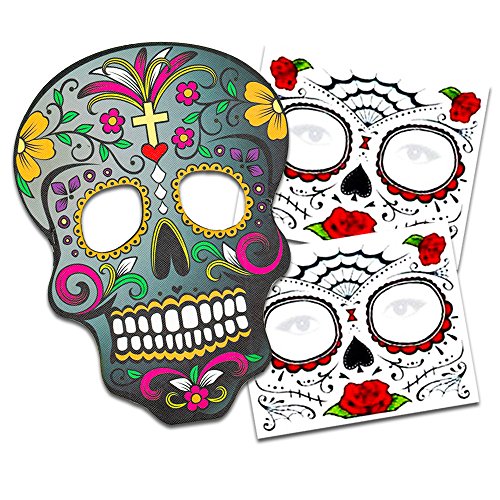 - Day of the Dead Sugar Skull Mask and Face Temporary Tattoos Costume Set - Includes a Day of the Dead Mask and Two 6" x 5" Sugar Skull Day of the Dead Face Tattoos.